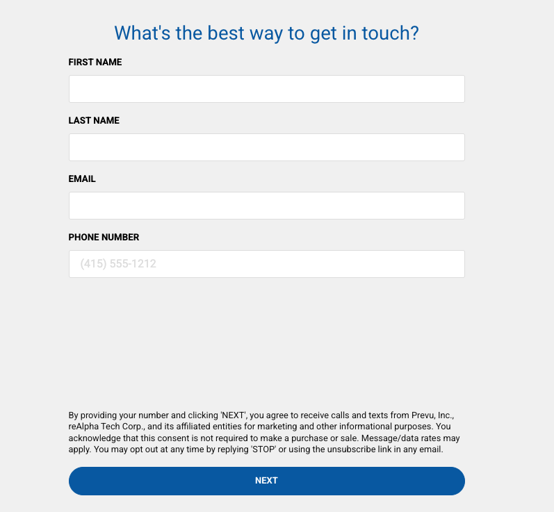 Enter your name, email, and phone number, then submit. This is how Prevu will contact you to discuss next steps and match you with an agent.