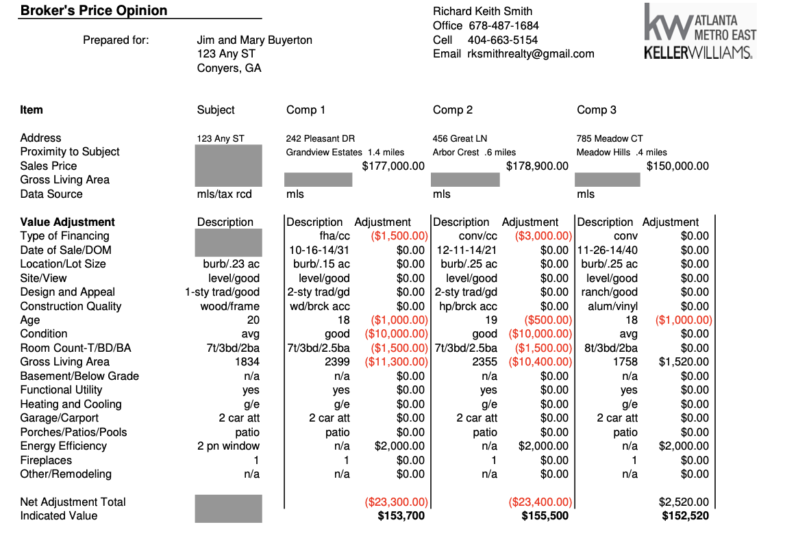 Here's a sample BPO report from real estate brokerage Keller Williams. Note that the report includes an estimated value of the home in question ("Subject"), along with sales prices and adjusted values for three comparable properties ("Comps").