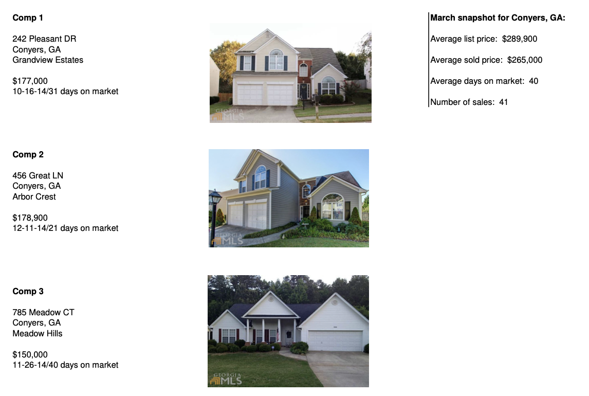 The second page of the BPO report includes photos of the properties along with basic information (address, price, days on market) and a brief market snapshot of the town of Conyers, GA, (average list price, average sold price, average days on market, and number of sales).