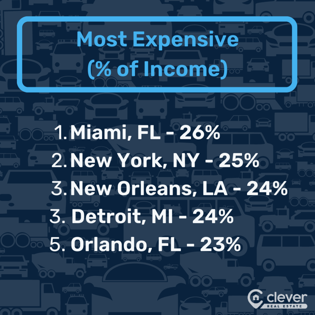 Buffalo may have fallen to second place this year, but it still wins in affordability. Based on all financial metrics, it's the most affordable city for commuters, while Miami is the most expensive.
