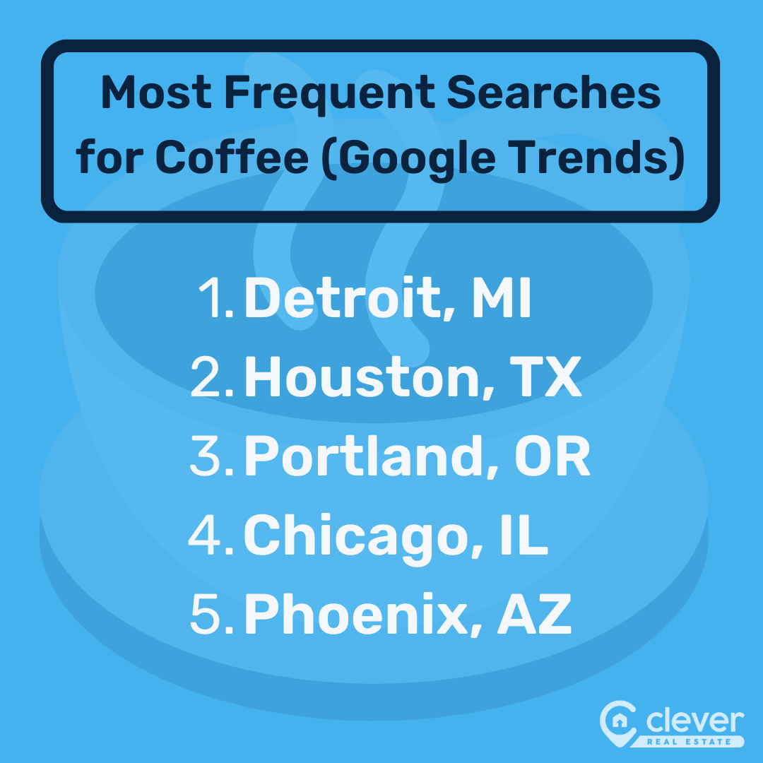 We've found that Detroit is one of the most popular coffee destinations, based on overall Google Trends search interest in the topic — more people are searching for coffee in Detroit than in any other city.