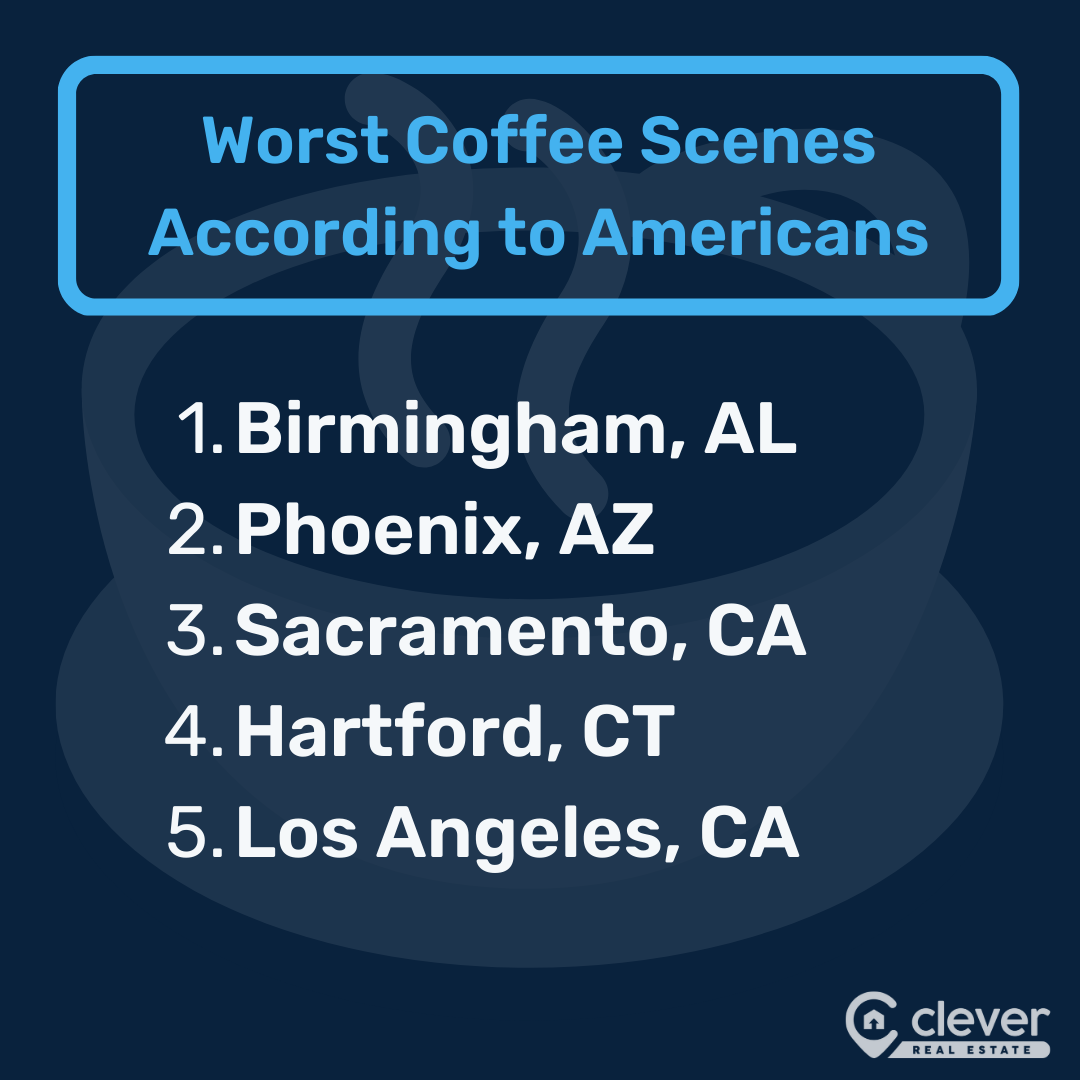 We also asked Americans to name which cities they think have the worst coffee scenes. Unfortunately for Birmingham, Alabama, Americans just aren't feeling the coffee there.