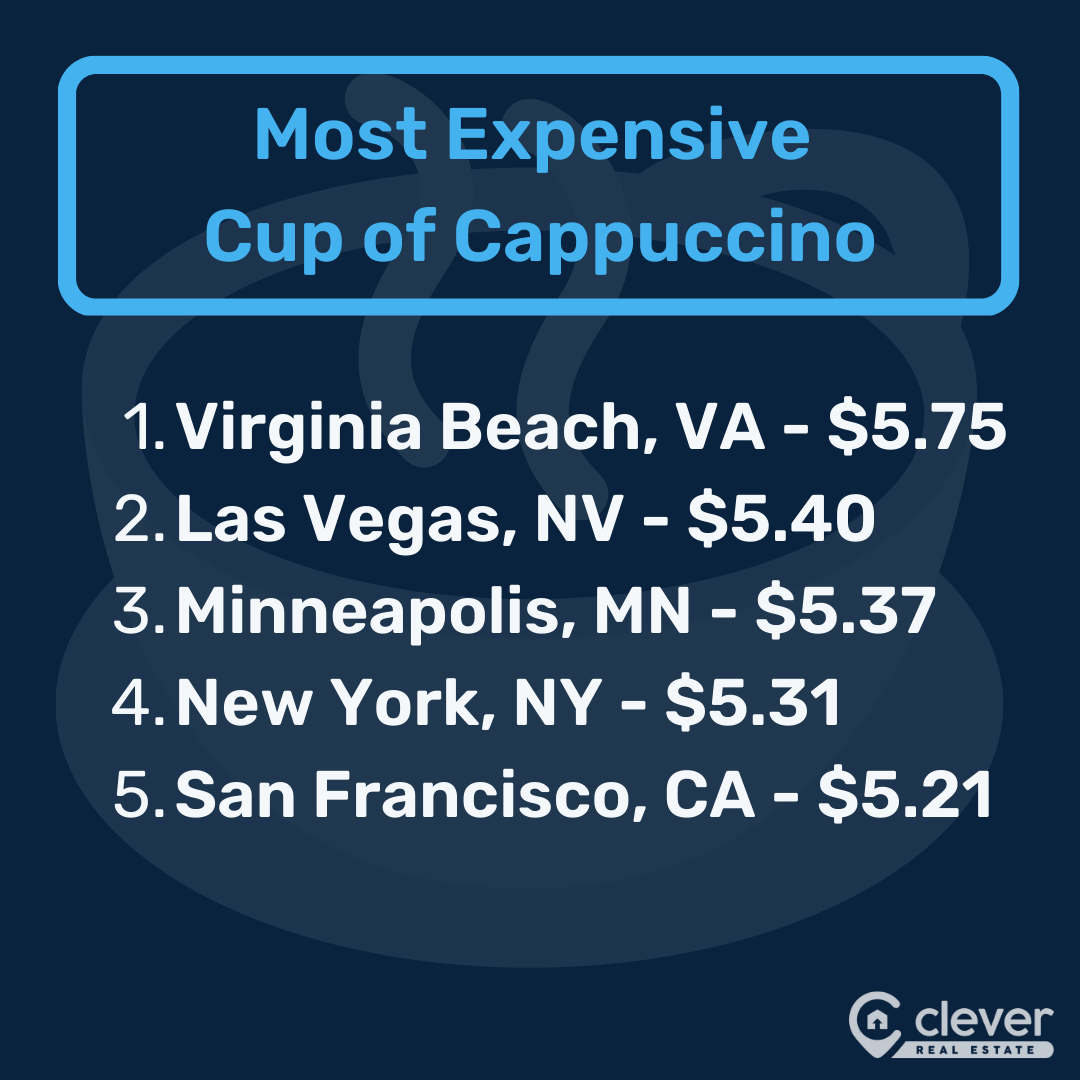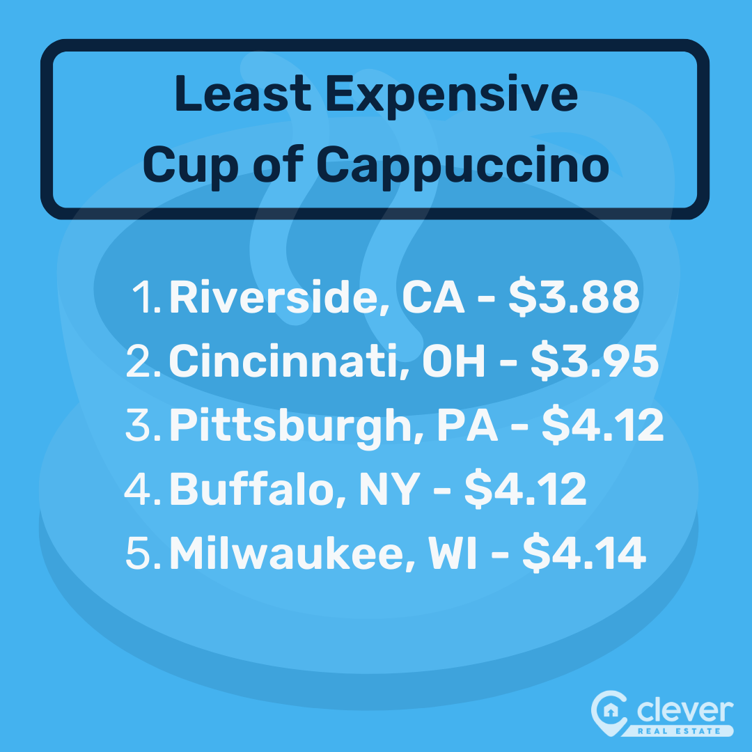 [4]A cup of coffee is the most expensive in Virginia Beach, Virginia, where an average cup of cappuccino costs $5.75. It's cheapest in Riverside, California, where they're only $3.88 on average.