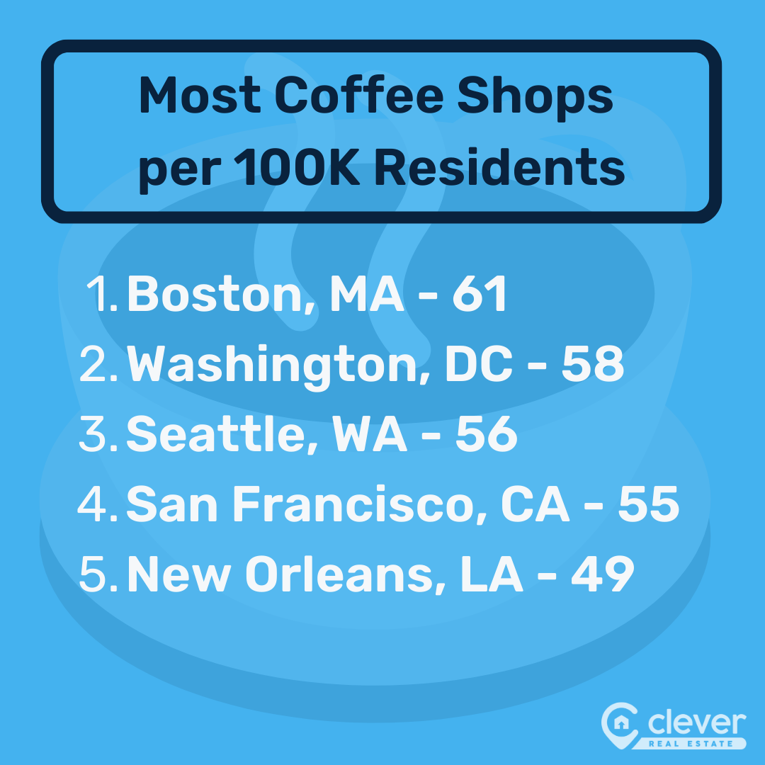 | ☕ Big Brews in Bean TownBoston has a whopping 61 coffee shops per 100,000 residents, the most of any city in our study. Compared to the average of 22.6 among cities in our study, that's nearly 3x the number of coffee shops! |