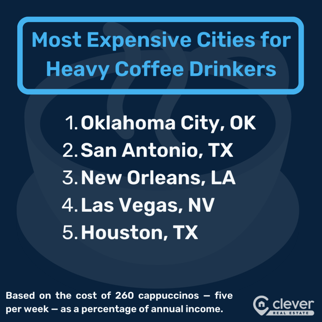 In Salt Lake City, a weekday cappuccino for a year costs 14% less of the median household income than in the average city. In SLC, heavy coffee drinkers spend just 1.41% of their income on coffee, compared to 1.65% nationally.