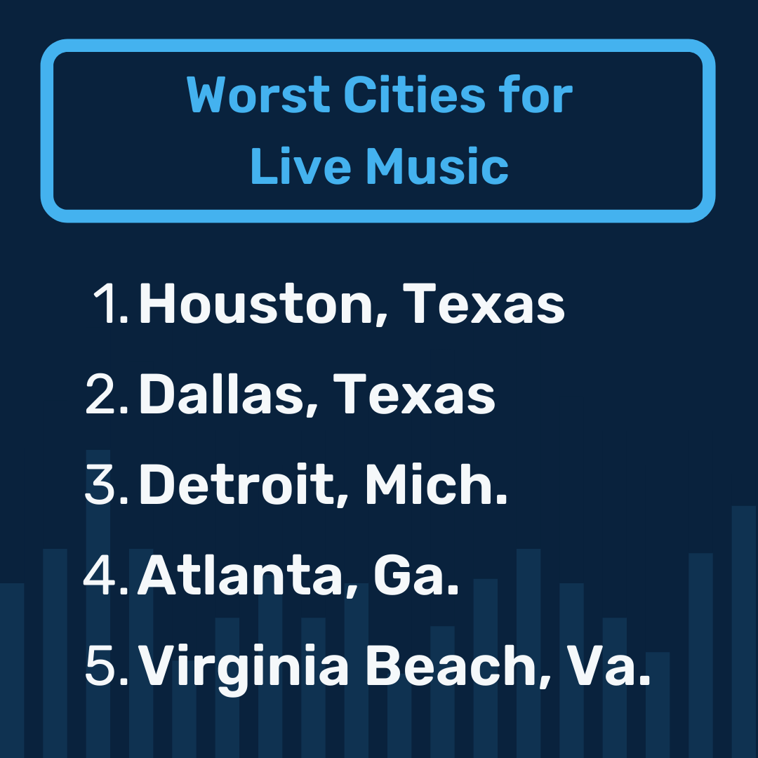 • The worst city for live music is Houston, followed by Dallas and Detroit.