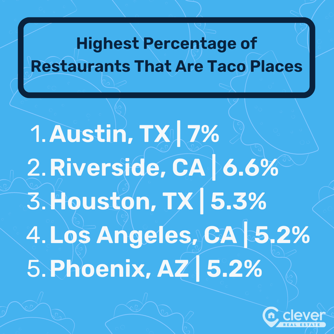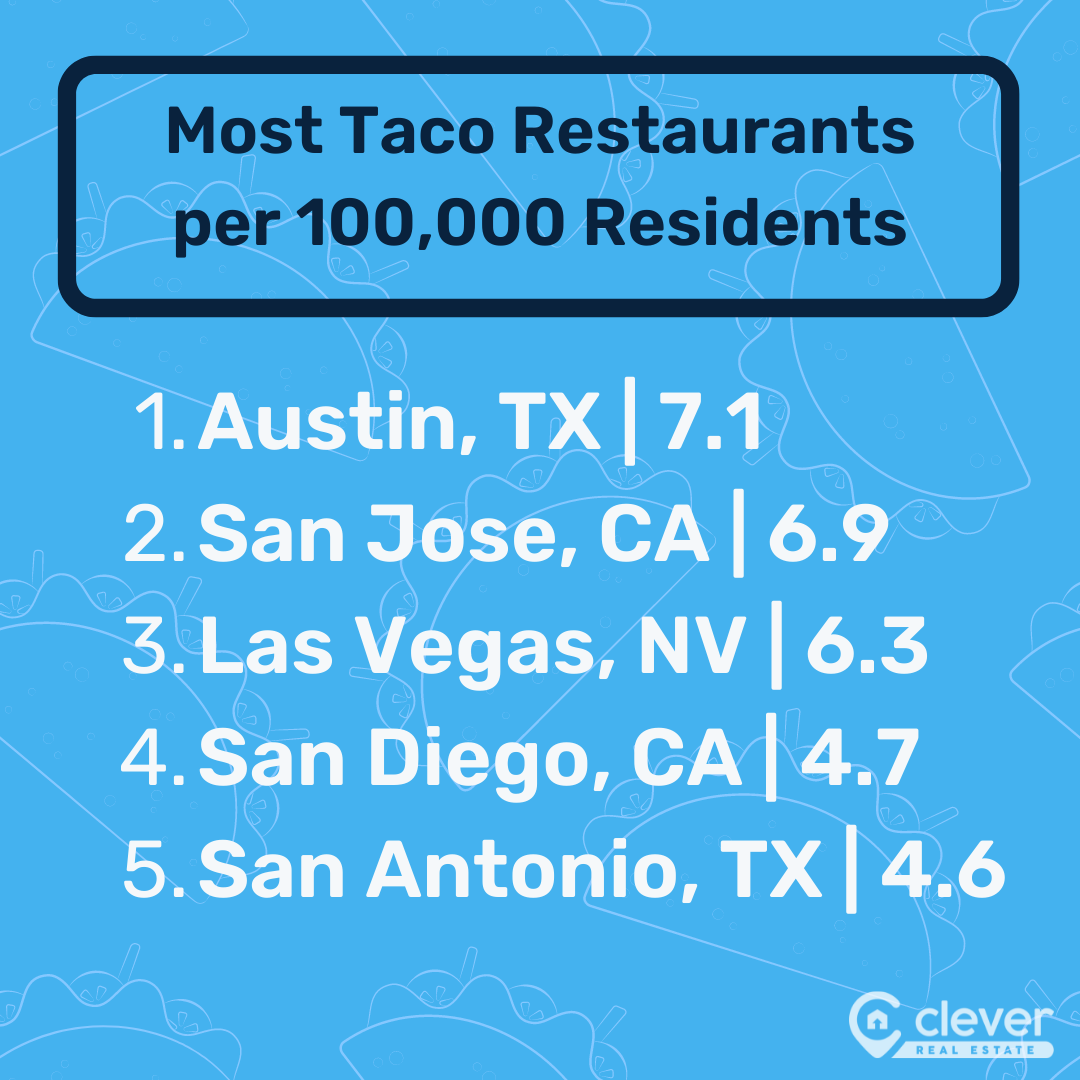 Austin, Texas, has the most taco places per capita at 7.1 taco restaurants per 100,000 residents. That's 255% more than the average city.