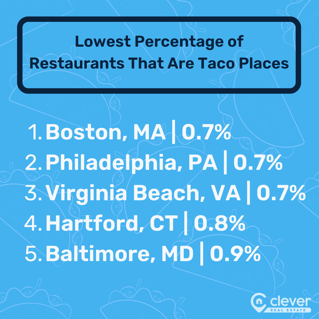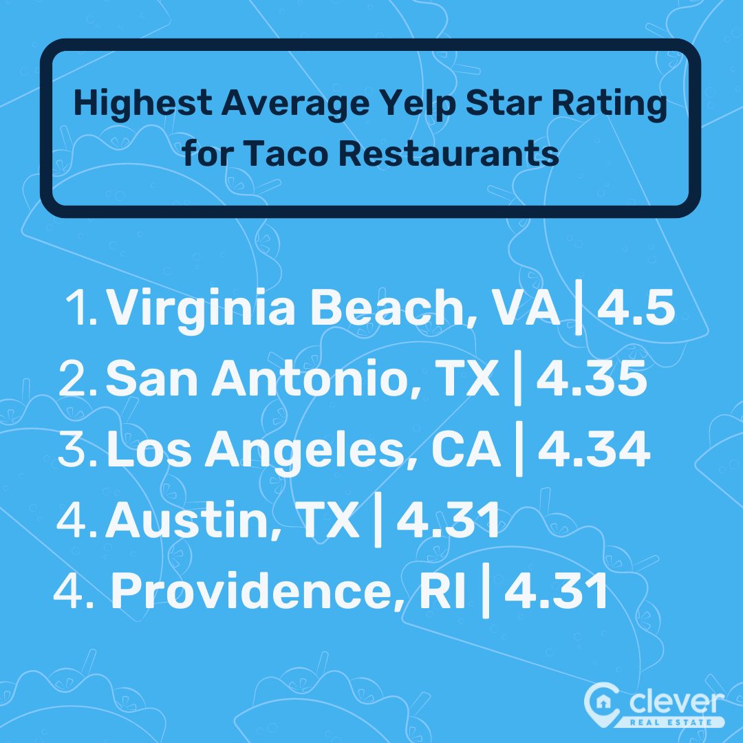 - Its taco places are low-rated: Taco restaurants in Hartford have an average Yelp star rating of 3.67, 9.4% lower than average. It's not surprising that Connecticut isn't where you'd run for tacos, but interestingly enough, Virginia Beach, Virginia, has the highest-rated taco places in our entire study with an average Yelp rating of 4.5. Although visitors may not be visiting these towns for tacos, it's meaningful when the locals actually enjoy the taco places in town — and says a lot when they don't.