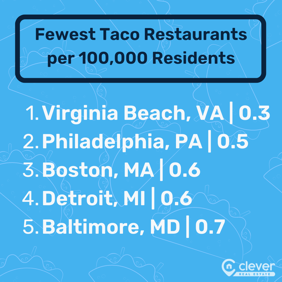- Number of taco restaurants per 100,000 residents (17.2%)