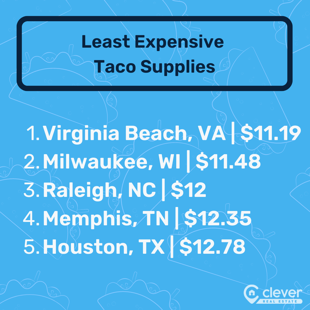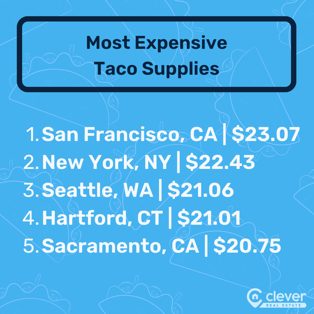 - The tacos are pricier: Taco supplies for three to four people are more expensive in the bottom 10 cities, costing an average of $18.50. That's 20.4% more than the average city ($15.37).