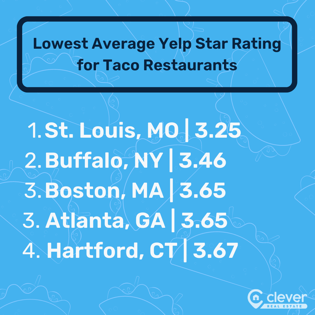 - The tacos ain't it: The average taco place in the bottom 10 cities in our study has an average Yelp star rating of 3.85. That's 4.9% lower than the average Yelp rating of taco restaurants in our study (4.05).