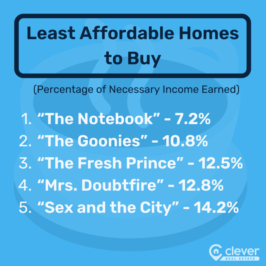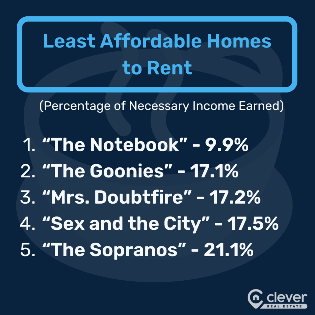 • In its restored state, the home from “The Notebook” would be the least affordable to Noah and Allie, who earn just 7.2% of the income required to buy it and 9.9% of the income required to rent it.