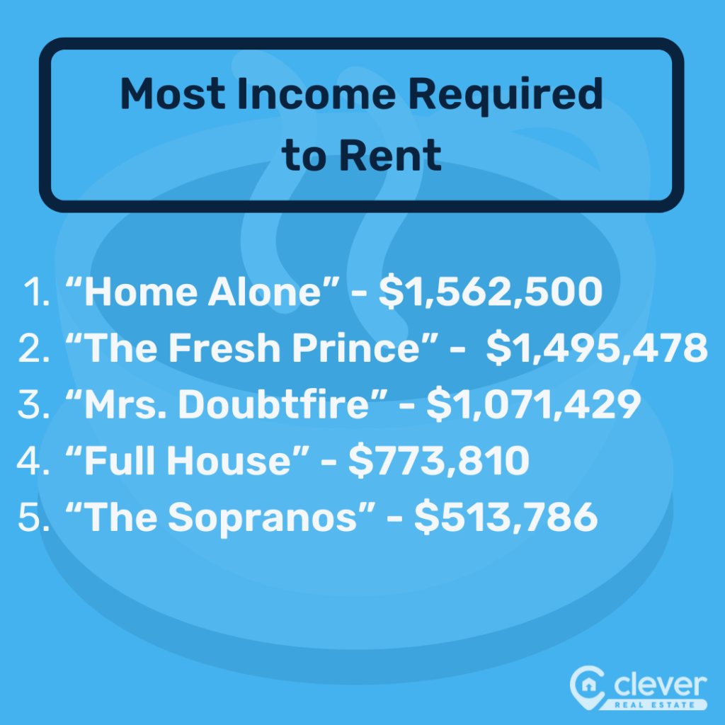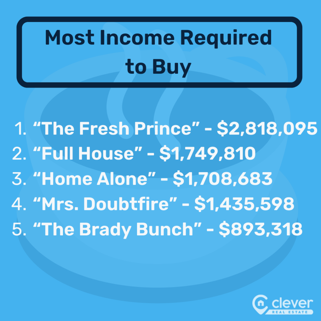 • In dollars, the largest gap between occupants’ incomes and the salary needed to buy a home is “The Fresh Prince of Bel-Air,” where Uncle Phil and Aunt Viv are an estimated $2,465,665 short.