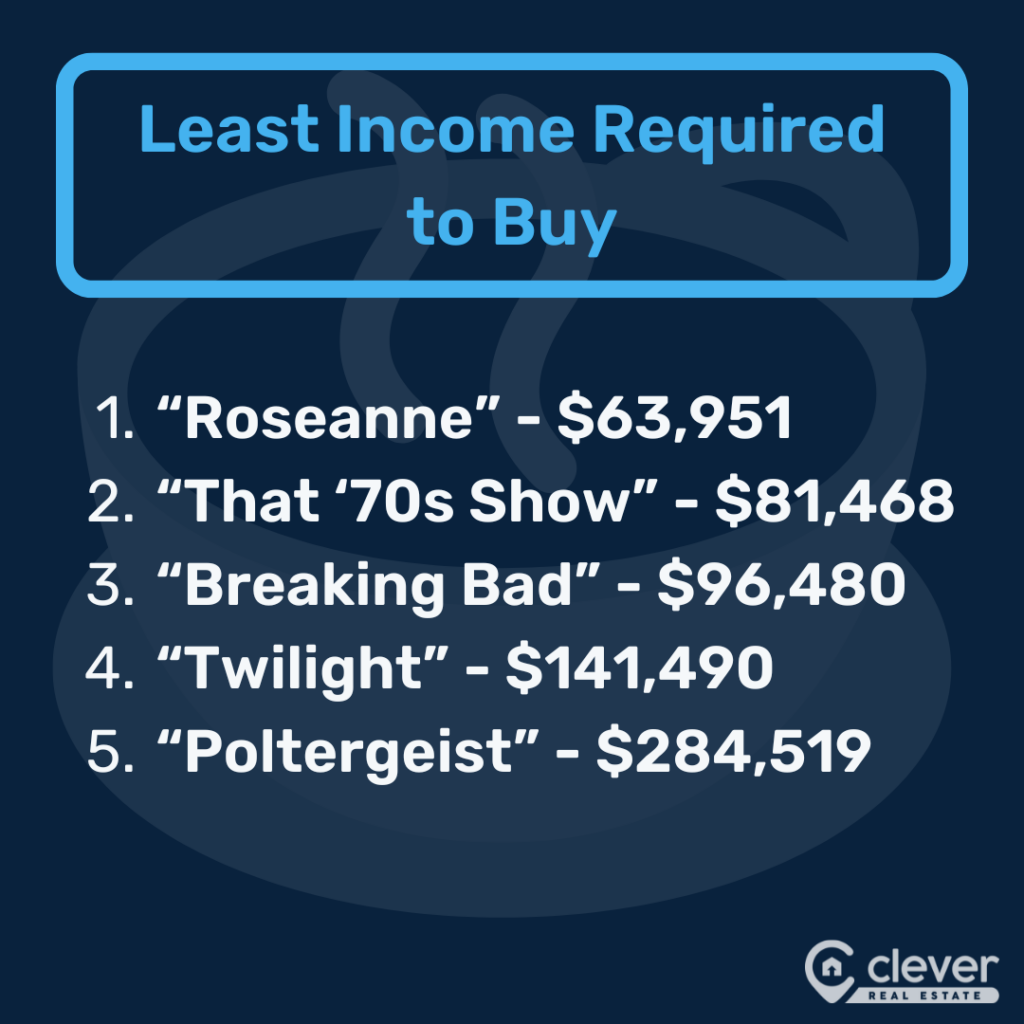 • Eleven homes (55%) were supposedly paid for with a single income. In those cases, none of their residents could afford to buy them, and only two — “Twilight” and “10 Things I Hate About You” — could afford to rent them in real life .