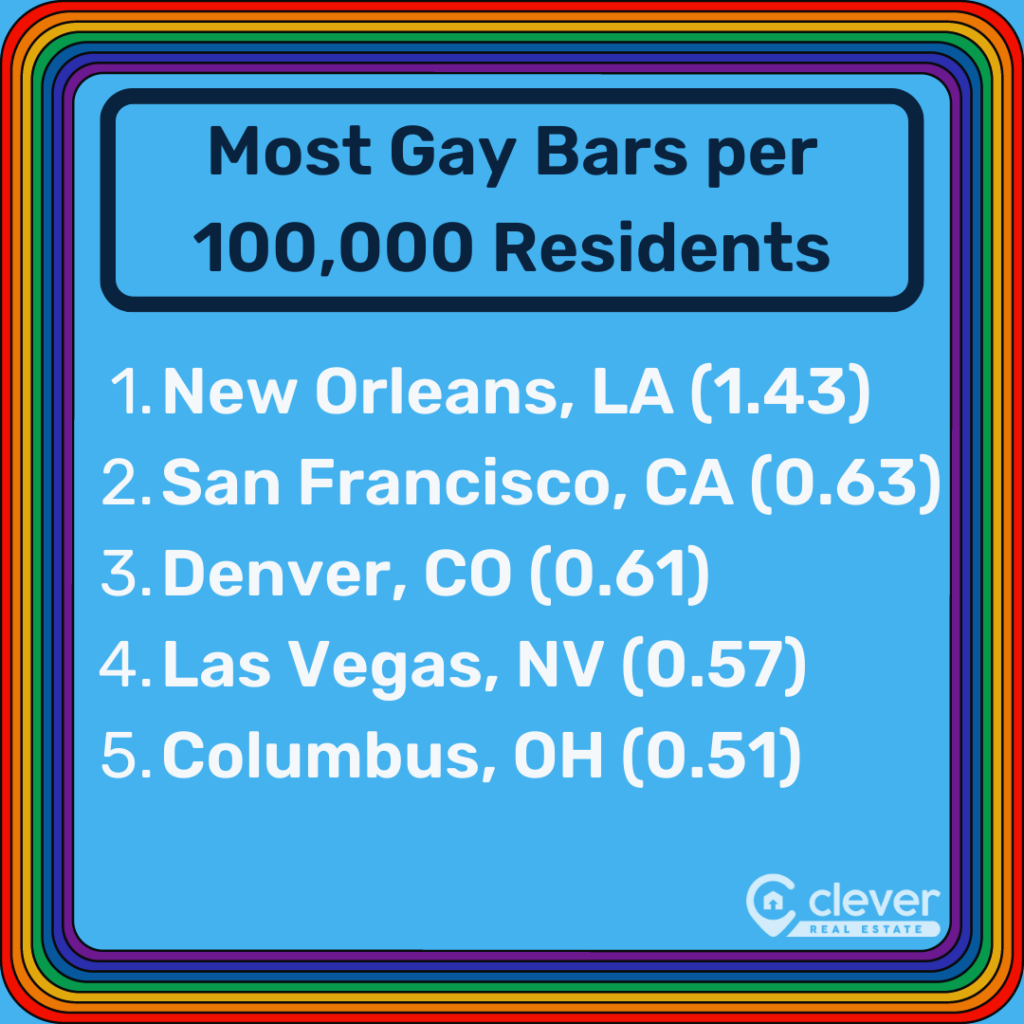 - New Orleans has the most gay bars per 100,000 residents (1.43), while Riverside, California, has the fewest (0.06).👇