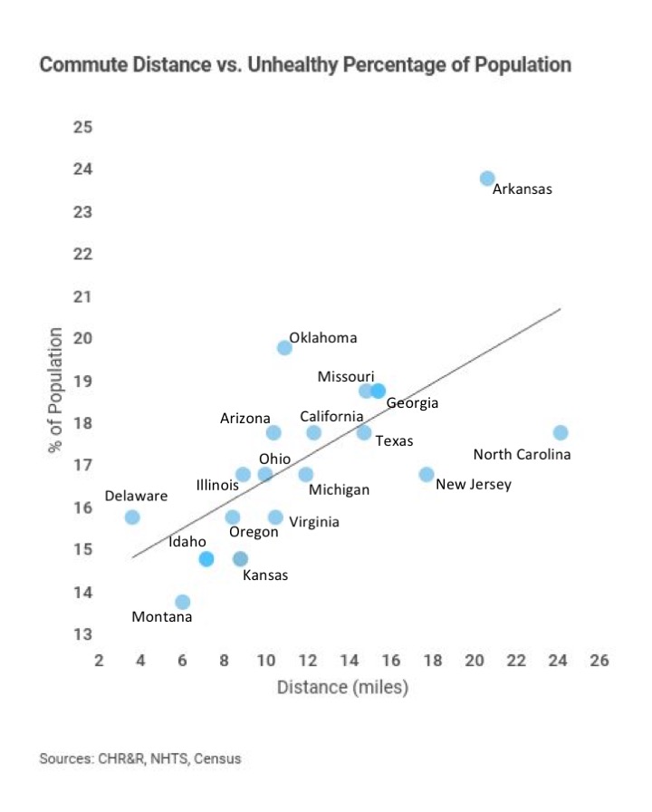 • Our analyses of U.S. Department of Transportation and County Health Rankings revealed that longer and farther commutes were linked to worse health outcomes