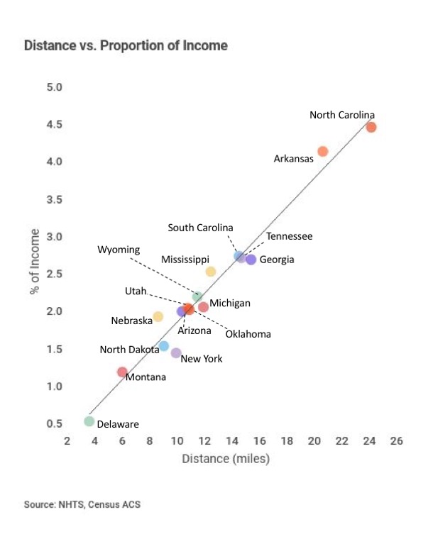 According to our analyses, longer distances to work are associated with lower incomes, so people who are driving the farthest are spending more out of their pocket (as opposed to the potential for earning additional wages) and making less money. As a result, people with farther commutes spend a larger proportion of their income on fuel and maintenance costs than those with shorter commutes.